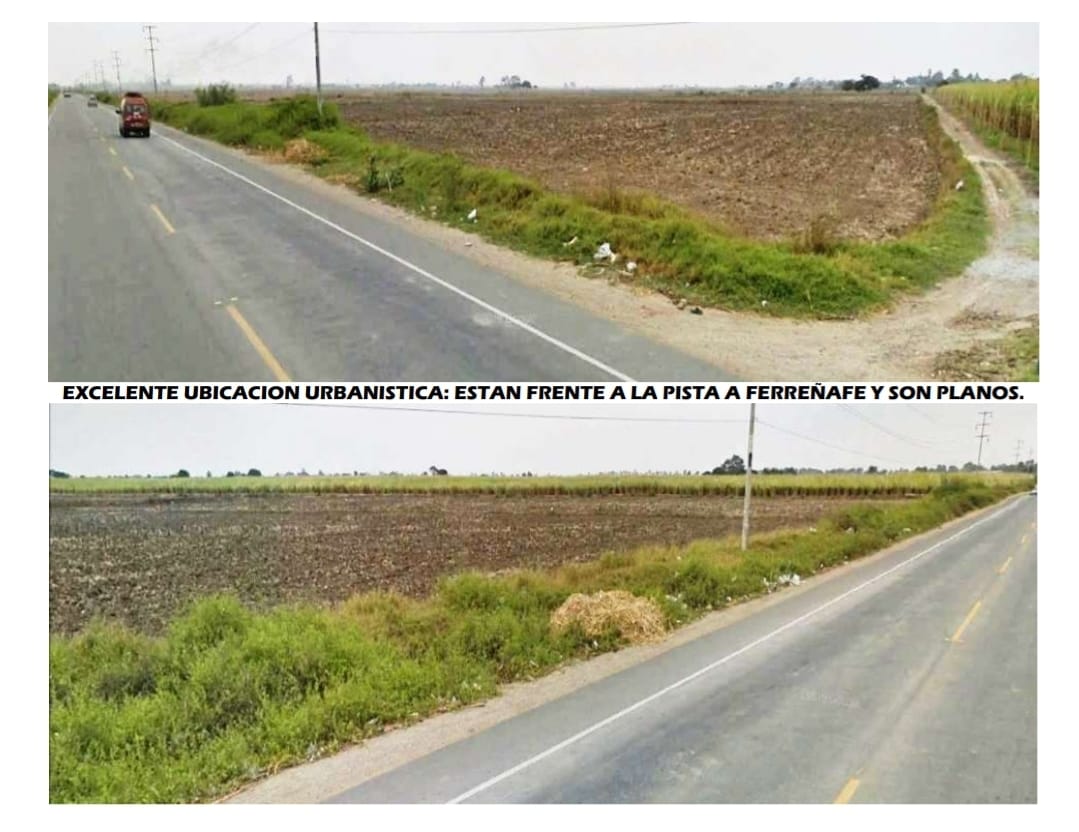Excelente terreno ubicado en una zona de expansión urbana (al costado de urbanización) y a filo de pista de la carretera Chiclayo-Ferreñafe (250 metros de frontera hacia la pista), está constituido por 3 lotes juntos. Tiene fácil y rápido acceso.