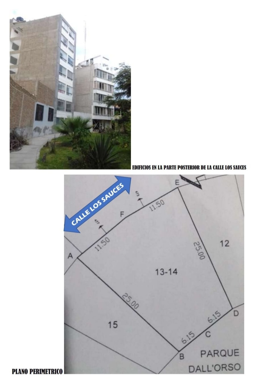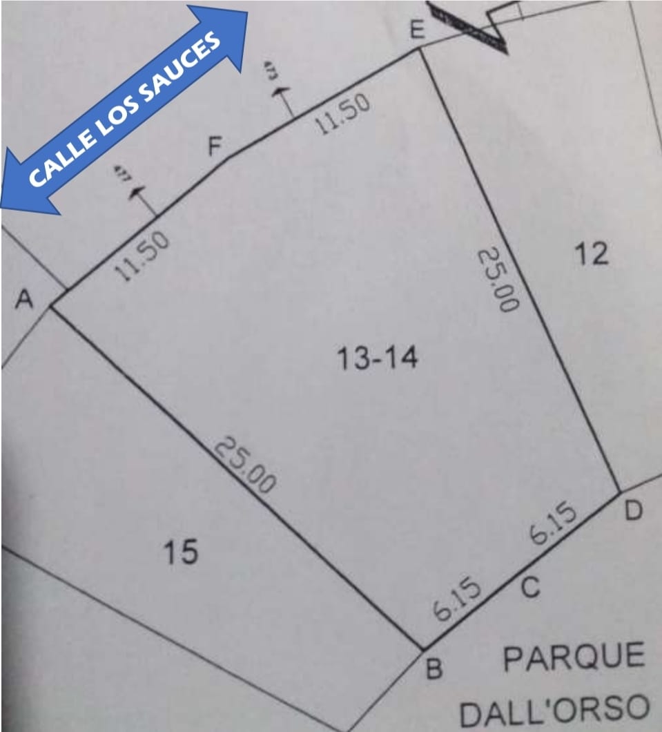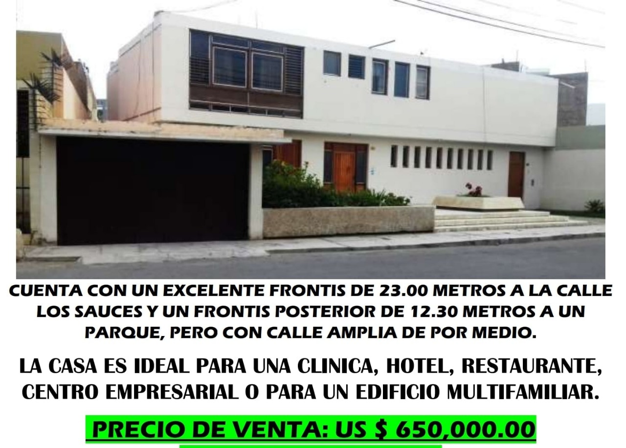 El Inmueble cuenta con 2 Frentes – Con una Frontera de 23 metros a la Calle Los Sauces y un frontis posterior de 12.30 metros a un parque.